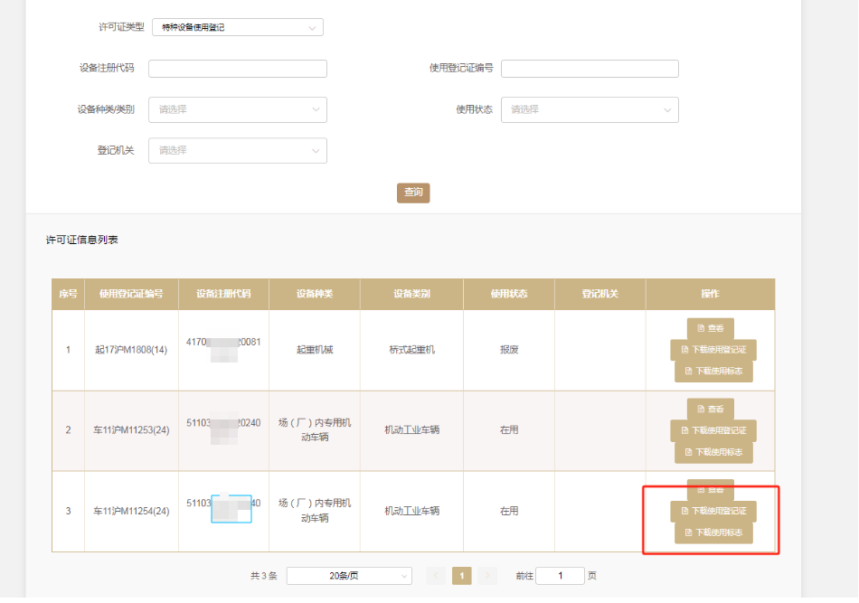 若需下载使用登记表及使用标志,请点击“我要下载电子证照”,在选项中选择“特种设备使用登记”,随后点击查询,并从列表中选取对应的设备进行下载。