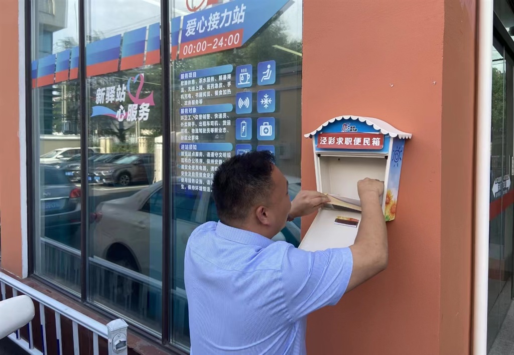 图片说明:工作人员在“泾彩求职便民箱”中取件