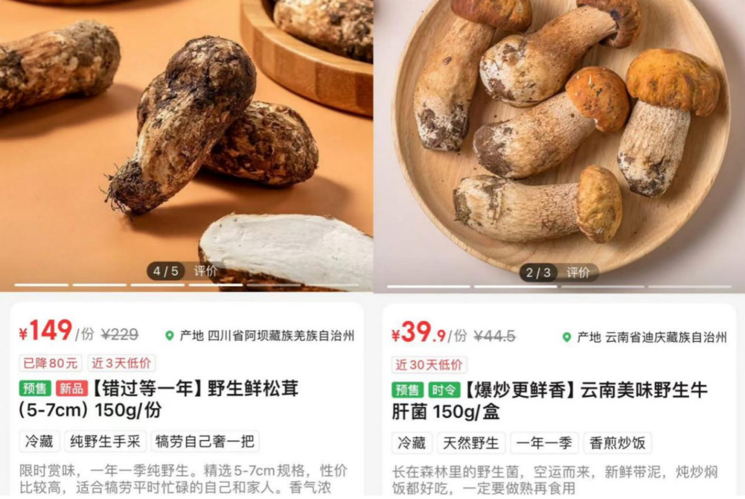 目前,在叮咚买菜APP上,野生美味牛肝菌、鸡枞菌、老人头菌、青头菌等野生菌150g规格的售价均在百元以下,其中5~7cm未开伞的新鲜野生美味牛肝菌活动价为39.9元/150g。据项艺博介绍,随着后续产量增加,各类野生菌的价格还将有所下降。