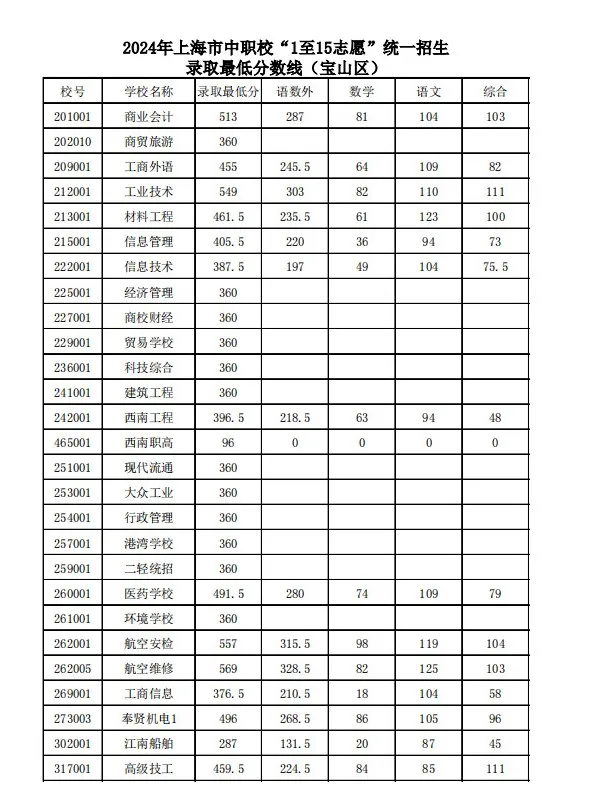 2024年上海市高中学校/中职校“1至15志愿”统一招生录取最低分数线(宝山区)现已公布。