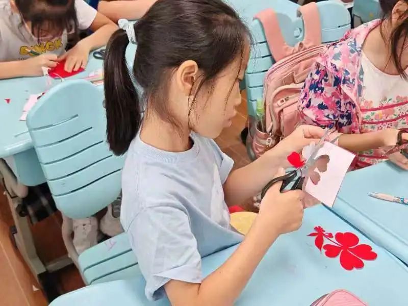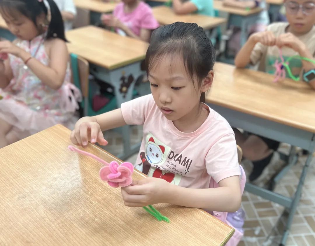 得益于之前成功的试点经验,这次暑托班的非遗体验得以更加全面地展开。在绒花制作活动中,孩子们将绒条捻转、折叠,做出一朵朵漂亮的玫瑰花,佩戴在衣服上、书包上。在捏面人学习中,孩子们亲手捏出了大熊猫、小兔子、大公鸡、小章鱼、向日葵等各种艺术形象。在剪纸体验中,孩子们学习了剪纸的历史起源和文化内涵,并在老师的指导下剪出了美丽的花朵和可爱的动物图案。“在绒花制作中,我提升了动手能力,也更加有耐心,完成了一个花朵作品,我感觉很有成就感。”参加暑托班的小朋友说。
