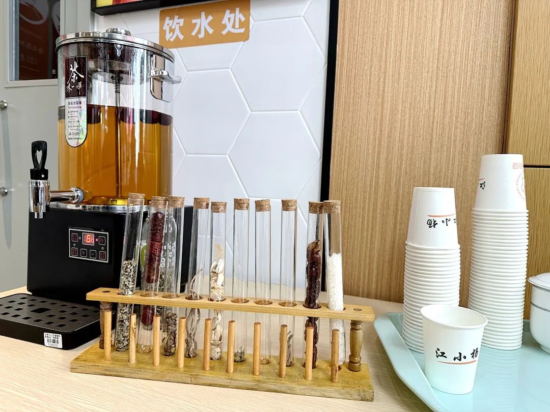 除了用餐,食堂还配备有体重秤、血压仪等设备,让社区长者们于细节处感受到满满的关心和体贴。“我们特别开辟了专门区域,每天准备养生茶,里面有西洋参、红枣、枸杞等,都是免费供应的,让老年人可以在吃完饭后,还能喝点茶休息。”江小杨饭堂店长高强表示。