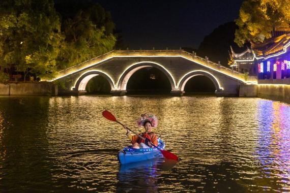 围绕“夜游、夜赏、夜食、夜娱、夜拍”五位一体,打造多元夜间体验。“泡泡大作战”深受孩子们喜爱,皮划艇与桨板组队夜游在国家级专业水上运动教练带领下受热捧,游客穿梭于水面与廊桥之间,感受古今交融。此外,野奢露营、马桥非遗美食、亲子小坦克、鸬鹚捕鱼、国潮旅拍基地等项目,满足了不同游客的需求。