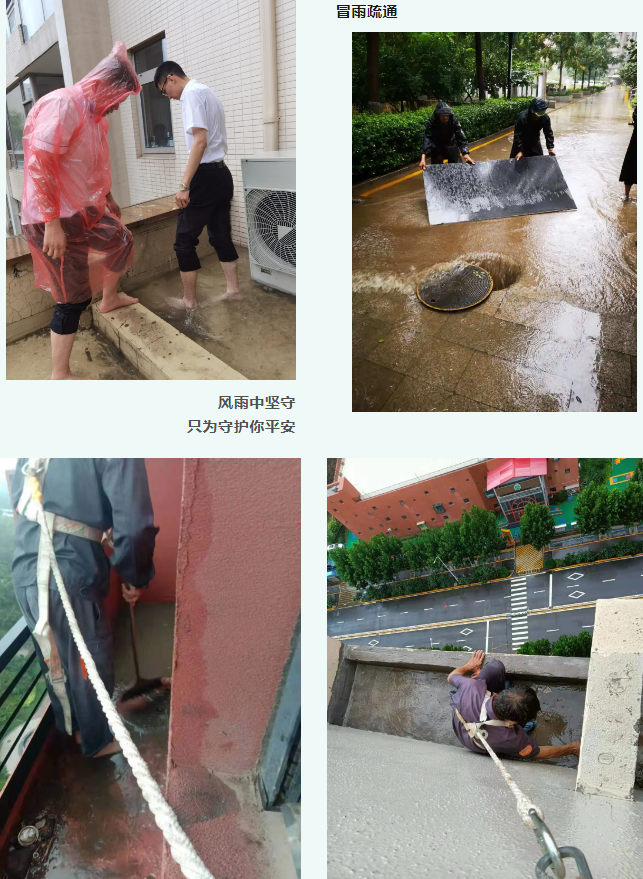 降雨虽大,但服务水平和响应不会因此受影响,第一时间处理业主遇见的各种问题和需求,将守护落实到每一处细节。组织清理积水、疏通排水口、放置防汛沙袋、竖立防洪挡板、架设水泵抽水,各岗位严阵以待,分工明确,在业主看到或看不到的地方做足安全保障。