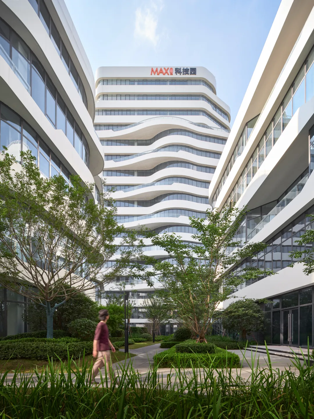 在建筑设计上,每栋单体建筑的外立面由似“山谷”峰峦叠嶂、富有韵律的白色曲面构成,打破了传统科创园区方正死板的造型特征。