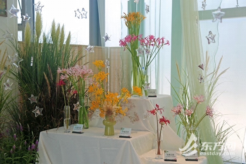 品种展示区:以诸多石蒜品种的瓶插展示和花艺作品展示为主。在武陵石蒜制成的滴胶垂帘和纱幔的映衬下,石蒜与各类观赏草的组合显得更加缥缈仙逸、别具一格。