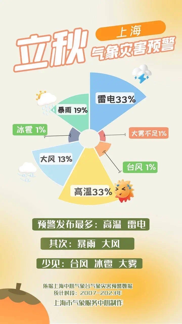 据上海市气象部门统计,立秋时节的上海高温和雷电预警发布频次最高,其次为暴雨和大风预警,偶有台风、冰雹和大雾预警。对上海来说,立秋只是暑热稍减,离秋天尚远。这周早晚体感比上周舒服了不少,不过白天依然炎热,请大家继续做好防暑降温。