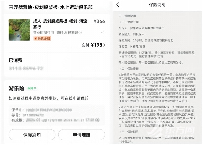 图说:记者购买的一家俱乐部桨板划行团购券显示包含游乐险,累计赔偿限额11万元。 图源:网购平台