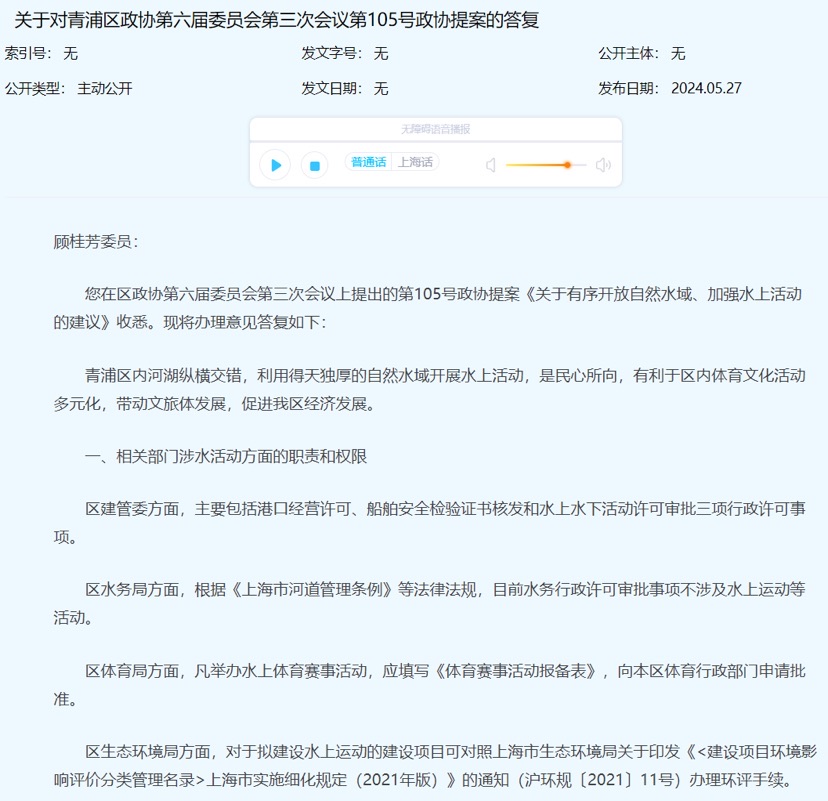 记者发现,今年5月,青浦区建设和管理委员会公开了对青浦区政协副主席、区体育局局长顾桂芳提出的《关于有序开放自然水域,加强水上活动的建议》提案的答复。