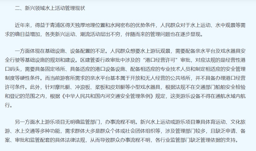 图说:青浦区建管委就新兴领域水上活动管理现状的看法。 图源:青浦区人民政府官网