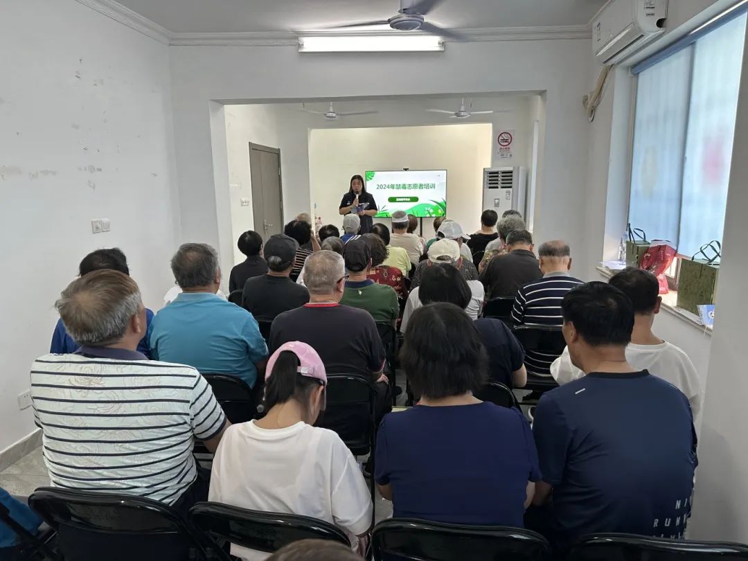 在淞南三村,禁毒社工为禁毒志愿者讲授了毒品基本知识、毒品的严重危害、毒品的预防宣传、志愿服务注意事项以及相关法律法规等内容,并分享了真实案例,帮助志愿者们系统掌握禁毒知识宣传技巧。