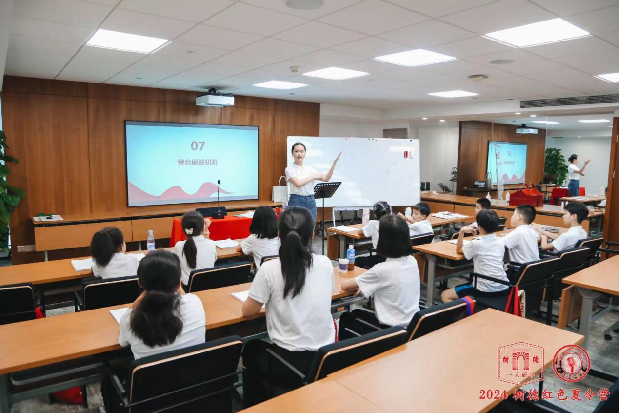夏令营期间,营员们不仅作为学习者和聆听者,还与一大专业讲解员面对面交流,学习如何成为一名优秀的青少年红色讲解员。在东方金话筒少儿艺术团老师们的指导下,通过《我是小小解说员》《奋笔疾书小工坊》《语音魅力解锁课》《“话里有话”速通课》等课程的培训和模拟实践,营员们纷纷化身“小讲解员”,成为红色故事的传播者。他们身着统一的营服,带着自信和激情,站在一大现场,用自己的声音讲述红色故事,让红色基因代代相传。