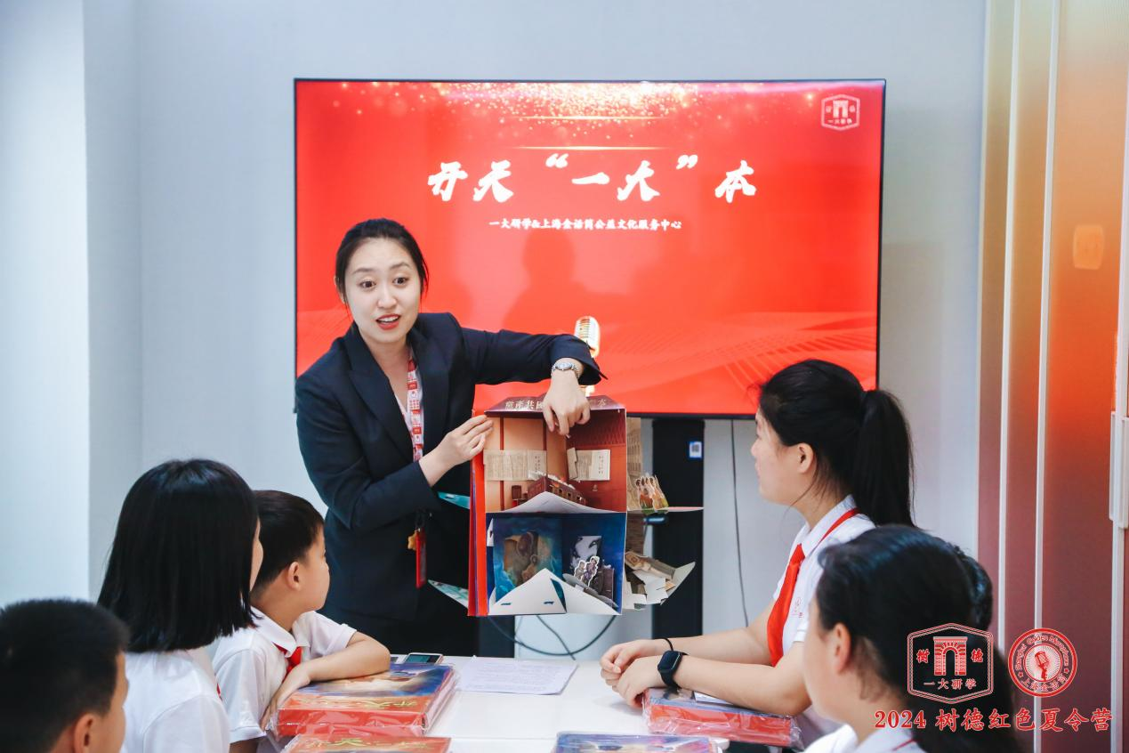 此外,同学们还学习了中共一大纪念馆配合“一大研学”推出的创意童书——《开天•“一大”本》。在《开天•“一大”本》立体书学习课程中,一大讲解员将书中呈现的八个红色历史故事,“南陈北李相约建党”“陈望道翻译《共产党宣言》”等,娓娓道来。同时,带领营员们动手触发书中的互动机关,让红色故事以动画形式走出书本,让党史变得可感知、可触摸、可互动,孩子们沉浸式学习党史知识,感受伟大建党精神,筑牢信仰之基。