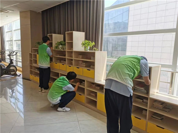 其他同学在一楼的图书馆进行书籍整理的工作,图书馆内藏书丰富,安静而充满书香,能满足不同年龄段读者的需求。