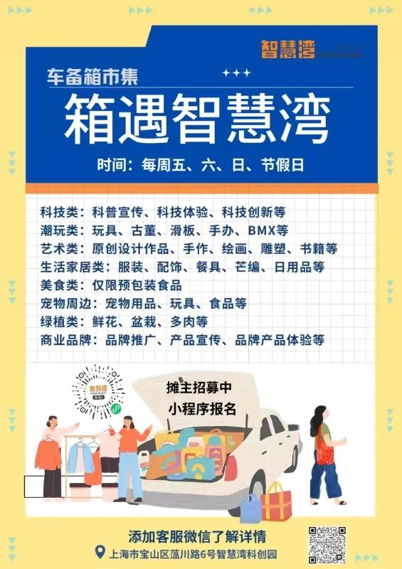 “箱遇”智慧湾车备箱市集作为一种新潮的娱乐和社交方式,打造包含了科技体验、潮玩手办、原创设计、生活家居、萌宠周边的五彩缤纷后备箱市集,用后备箱承载年轻人对美好生活的表达和追求,潮玩乐购,一站式拥有!智慧湾更多精彩活动请戳下图查收。