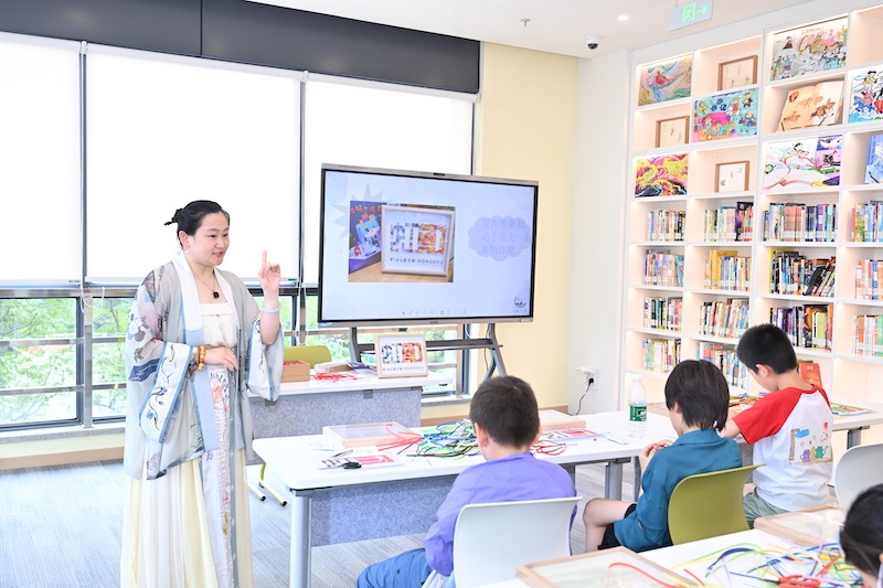 在三楼全新启用的少儿图书室内,也同步开展了两场少儿活动,来自华东师范大学设计学院的插画师、上海科普作家协会亲子阅读推广人黄安琪老师,在低幼阅览区面向亲子家庭作了题为“丝路上的敦煌”绘本分享;在学龄儿童阅览区,小读者们在专业老师的指导下,体验“纸上生花”衍纸手作,以衍纸画的形式创作虹口文化地标。