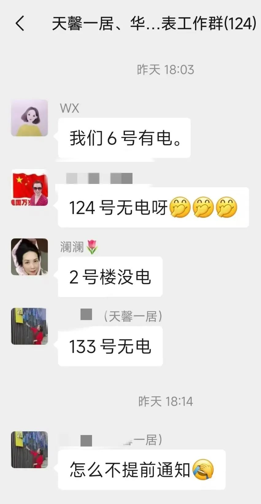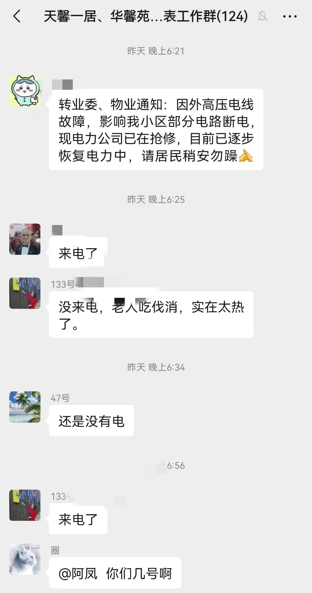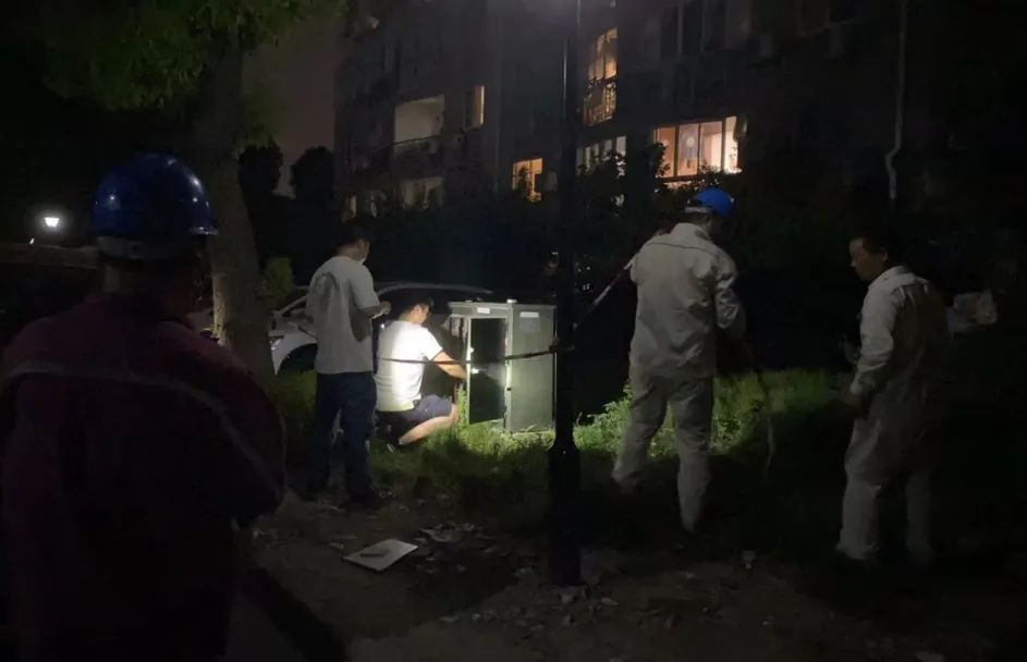 天馨一居党总支、天馨二居党总支在收到停电的消息后,党总支书记、社工、居委会、业委会、社区民警第一时间到达现场了解情况,对受影响的居民们进行劝解,安抚工作,排查小区内独居老人等特殊群体情况。同时积极协调物业、电力公司施工人员,加紧排查原因,发现是附近有高压线因高温熔断,造成了此次停电。
