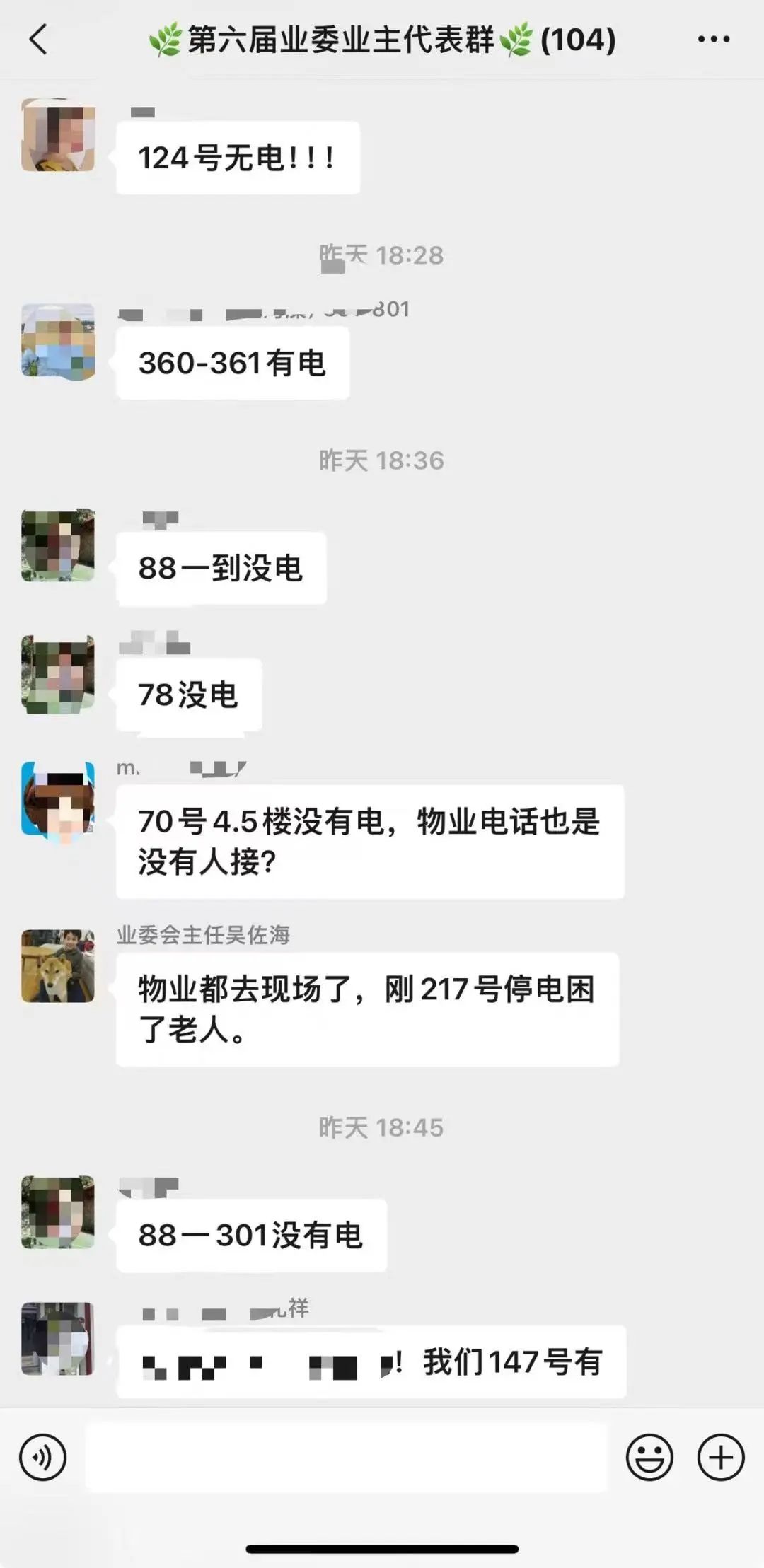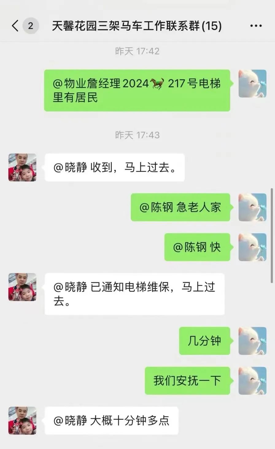 为尽快完成抢修,电力公司协调人员、设备,分段作业。物业开启应急预案,并在“三驾马车”群内通报进度。过程中,业委会工作人员实时跟进,向居民耐心解释,物业经理始终坚持在一线,跟进电力抢修进度,居委社工协助在楼道群内发布温馨提示,安抚居民情绪。“三驾马车”始终坚守现场,及时向居民反馈抢修进度,确保信息同步。