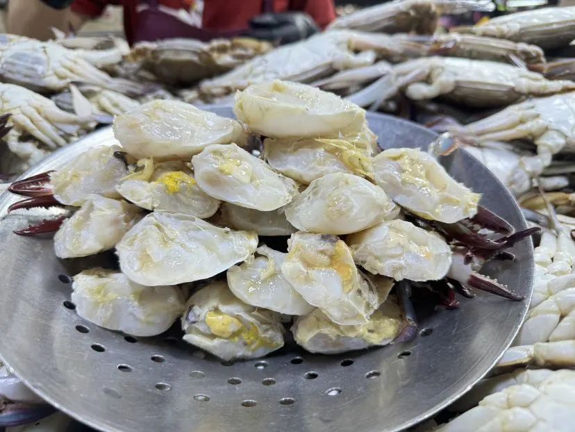 市民周阿婆说:“今年梭子蟹价格实惠,品质又好,新鲜得不得了!我是老顾客了。清蒸最能保留原味,水分少,肉厚实,还有满满的蟹黄,很美味!”