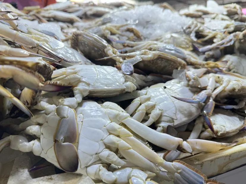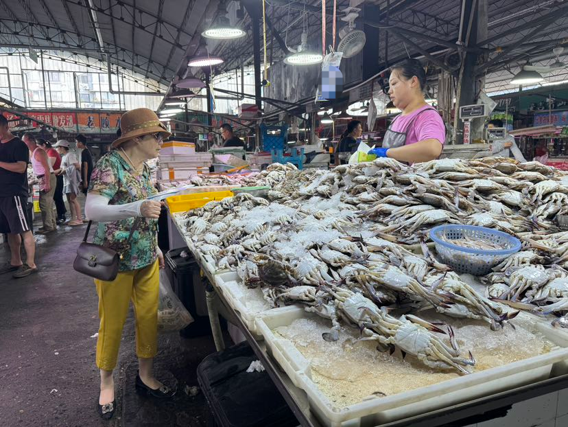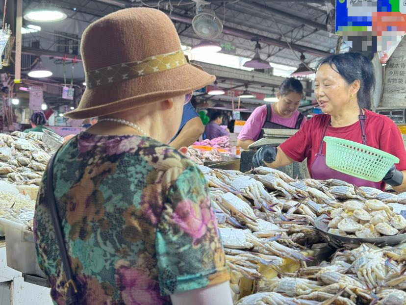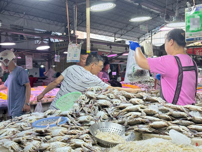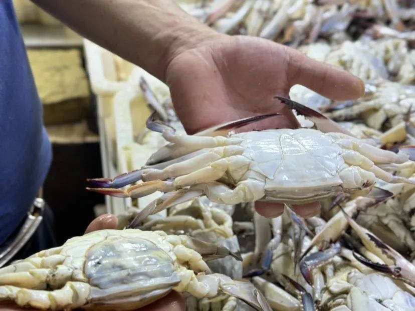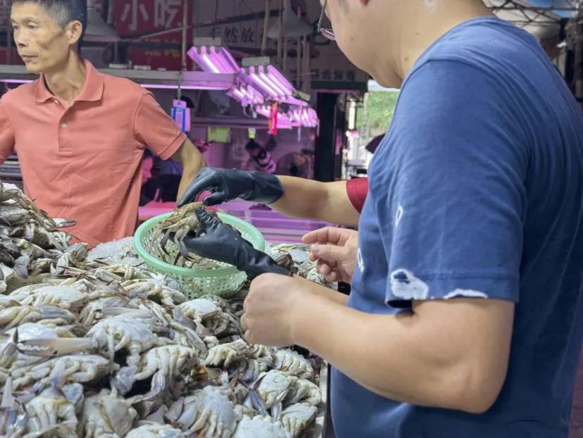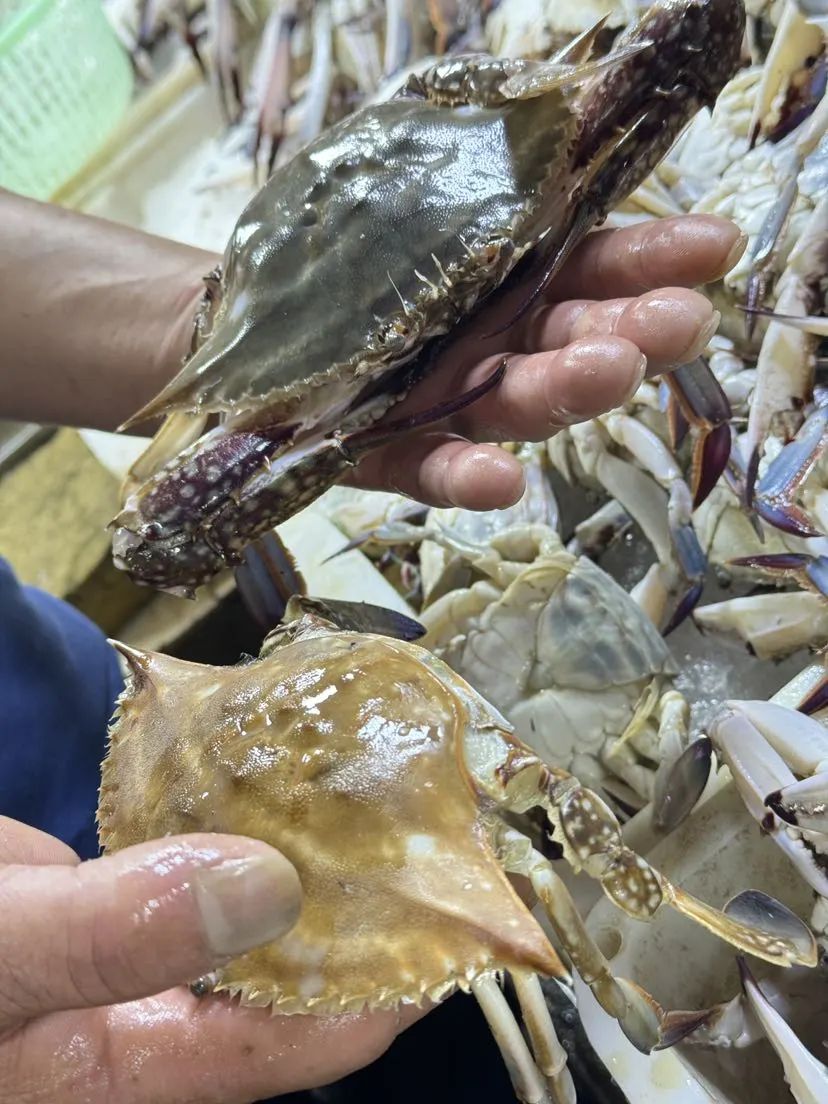 如何挑选梭子蟹,和水产打交道30多年的摊主,捞出两只蟹做示范。“新鲜的梭子蟹白一点,纹路清晰,腿结实,更壮一点,分量掂着重。头部没有黑点,壳偏青。”