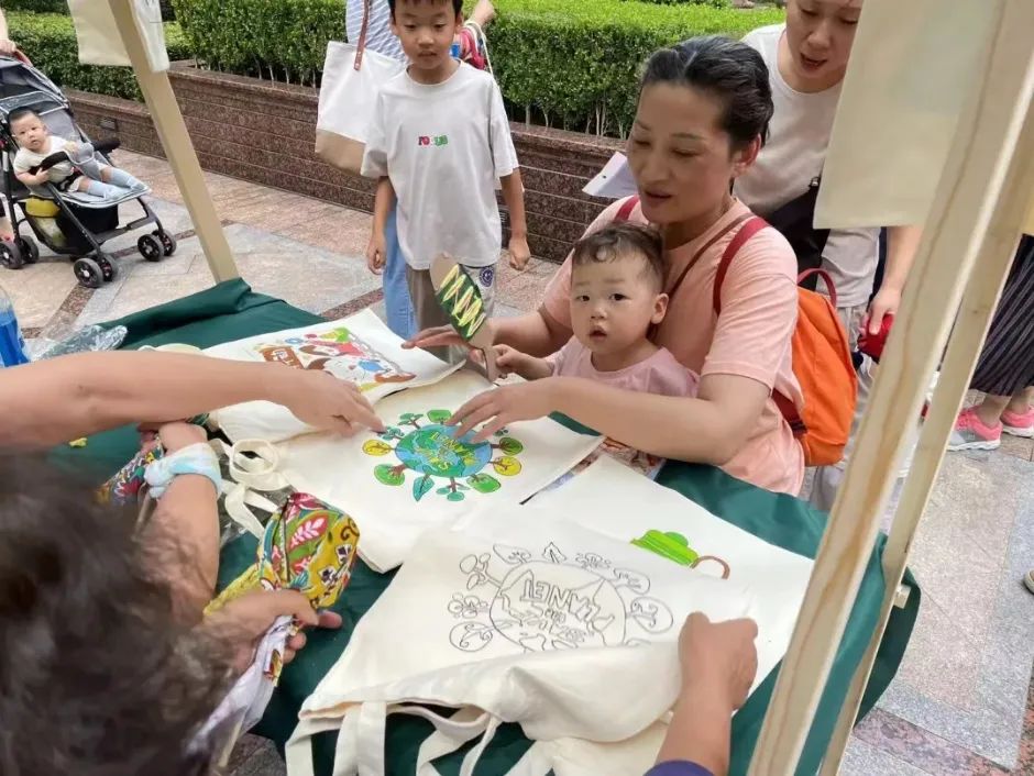 另一边,文明大市集设置了多个内容丰富的活动区域。在游戏体验区,石头绘画摊位前,小朋友们手持画笔绘环保,让普通的石头披上“彩衣”;充满传统特色的艾草养身锤制作摊位深受社区老人的喜爱,大家互相帮助,一边制作,一边分享养生知识;在环保手提袋涂鸦摊位,大家尝试在环保手提袋上涂色,这些手提袋不仅实用,而且充满了创意和艺术感,背在肩上就是一道环保靓丽风景线。