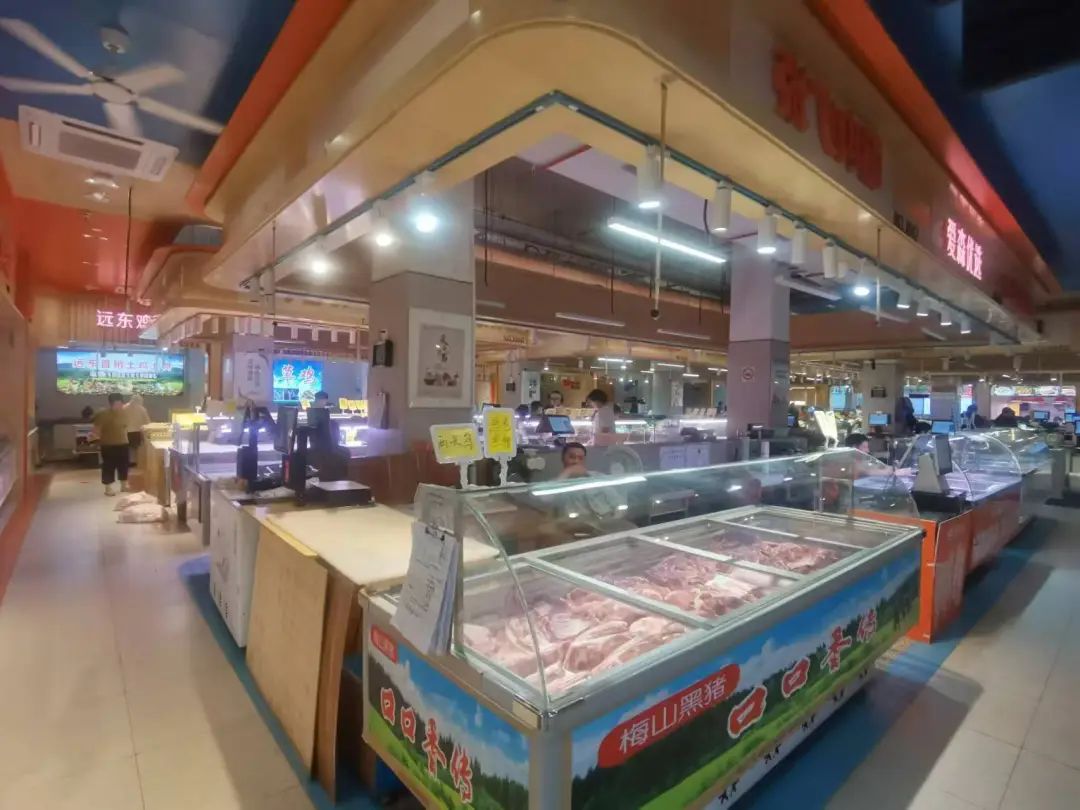 进入室内菜市场,这里的布局清晰有序。侯红文指着冰箱介绍说,更新后,这里所有的冰箱、柜面都是定做的。隔着玻璃,顾客的手无法直接接触肉类等食物,同时,在与摊主交流时,口水也不会飞溅到肉品上,确保了食品的卫生与安全。