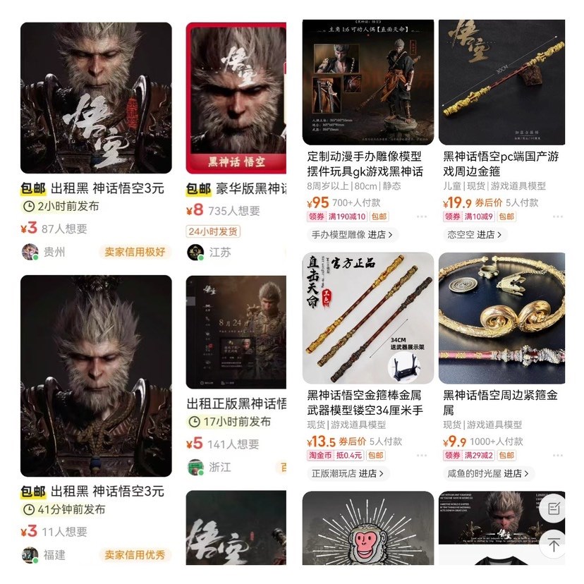 纵相新闻发现,有平台商家以明显低于正版的价格销售该游戏,甚至打出了“1分钱踏上西游路”的租号广告语。此外,一些打着游戏名号的周边、手办等产品也十分热销。