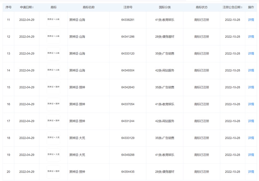 不仅如此,深圳游科还申请了“黑神话·山海”“黑神话哪吒”“黑神话牛魔王”“黑神话小倩”“黑神话姜子牙”等一系列商标,这或许意味着《黑神话:悟空》推出之后,将会有更多的《黑神话》系列作品问世。