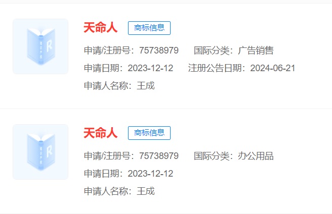 不过,该游戏中玩家扮演的角色“天命人”已被抢注。公开信息显示,2023年12月,自然人王某申请注册2枚“天命人”商标,国际分类为广告销售、办公用品。目前,上述商标已成功注册。