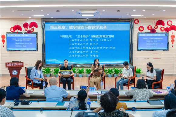 蒙山中学陈子怡、张屹轩,前京中学缪倩,漕泾中学潘一丹,金卫中学何绮健围绕“三个助手”赋能教育高质发展展开科研论坛,讨论了“三个助手”的应用与实效、难点与策略以及对“双新”推进的作用等话题,立意深远、引人深思。