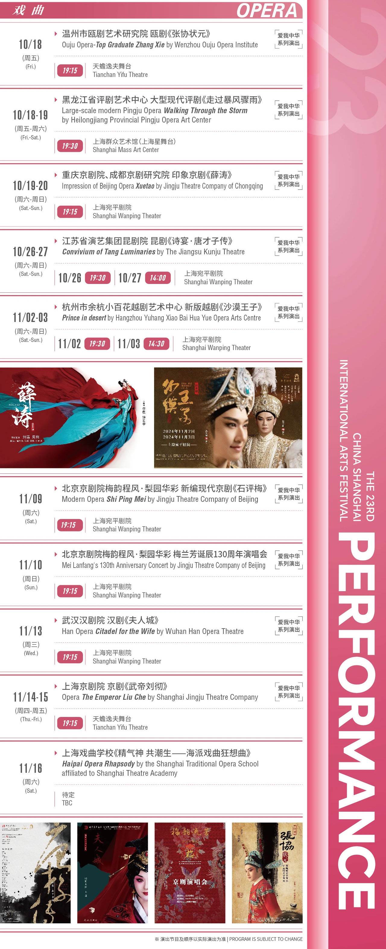 10月1日京剧演唱会群星荟萃,上海京剧院老中青三代艺术家呈现近三十年原创剧目中的经典唱段,展示上海京剧院的创作成果。10月2日王珮瑜领衔主演《红鬃烈马》。10月3日李军、吕洋、王越,京津沪三地艺术家共同主演《大保国·探皇陵·二进宫》。10月4日邀请中国文联副主席、有京剧界“帕瓦罗蒂”之称的孟广禄担纲主演《普天乐》,尽显裘派花脸韵味。10月5日《杨门女将》由高红梅领衔,全剧行当齐全,展现上京青年人才风貌。10月6日罗晨雪、胡维露主演《牡丹亭》细腻再现绮丽一梦。10月7日吴双主演《水淹七军》等经典折子戏文武双全,刚柔并济。
