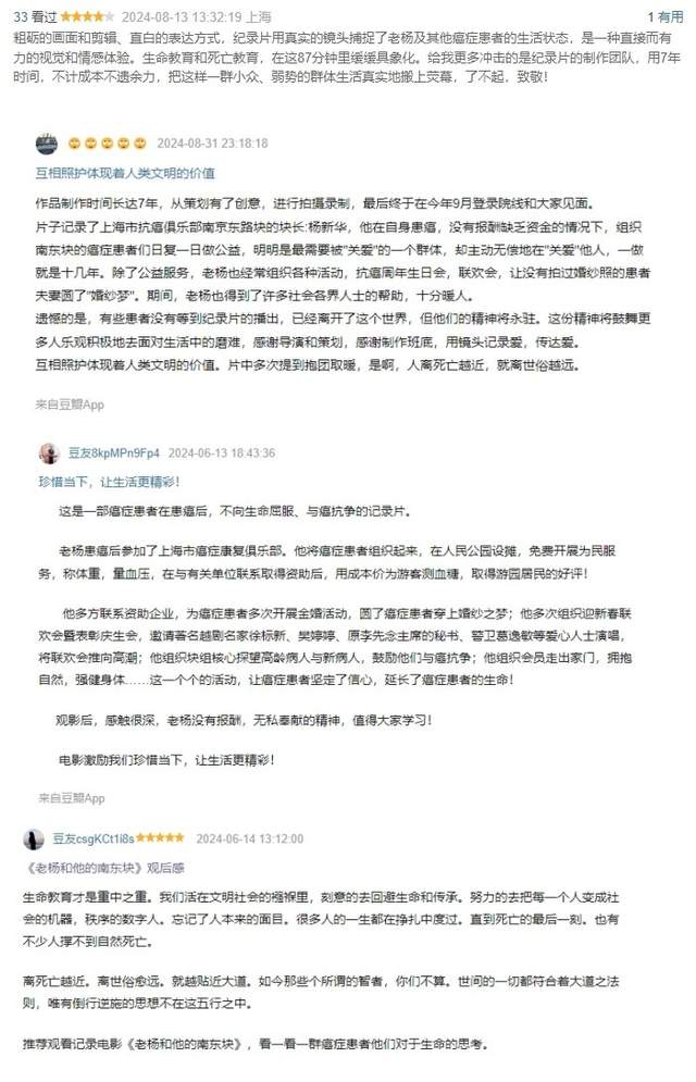 该纪录片上映后不久,在网络上引发热议。一位豆瓣网友留言称,生命教育是重中之重。我们活在文明社会的襁褓里,却刻意的去回避生命和传承。从老杨和他的朋友们身上,我们瞬间明白了一个道理,离死亡越近,离世俗愈远。推荐观看记录电影《老杨和他的南东块》,看一看癌症患者对于生命的思考。