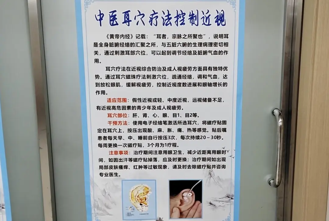 “之前200多度,今天检查下来度数升高了。”中医眼科医师杨倩建议,在佩戴眼镜的同时,可以叠加中医适宜技术进行治疗。“我们将耳穴疗法应用到近视治疗,通过在耳朵多个穴位压上磁珠,疏通经络、调和气血,从而达到放松眼肌、缓解视疲劳、控制近视度数进展和眼轴增长的作用。”杨倩介绍。
