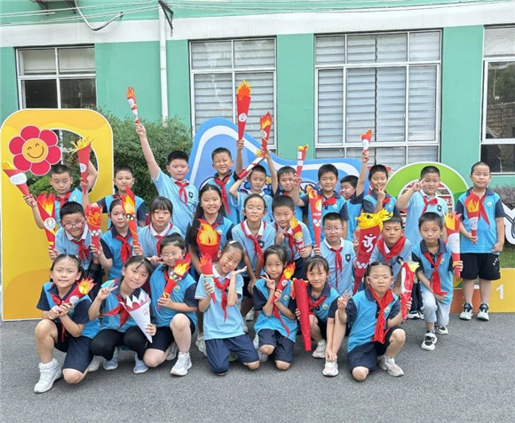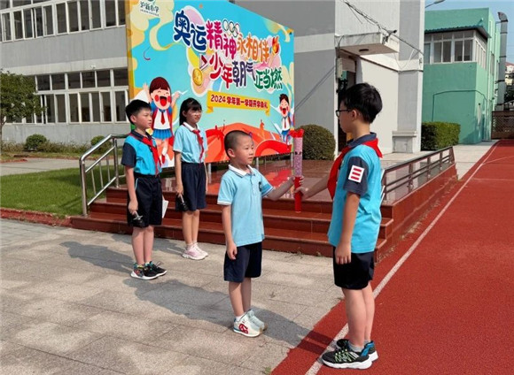 在庄严的国旗下,五年级学生代表夏易铭迈着坚定的步伐,将手中的奥运火炬传递给了一年级新生代表温佳睿。这一传递不仅象征着奥运精神的传承与发扬,更寓意着沪新小学新、老学子的接力与传承。