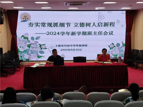为确保新学期的教育教学活动顺利、有序进行,并促进学校的持续优质发展,8月28日,川沙中学华夏西校组织召开行政会议。党支部书记、校长黎肖鸿在会上部署了新学期各部门的工作安排,要求以"落实立德树人,推进‘双新’实践”为工作目标,全力以赴做好开学前的准备工作。