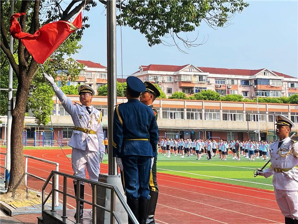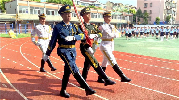 随着雄壮的国歌声响起,开学典礼正式拉开帷幕。担任本次升旗手的是英姿飒爽的仪仗队教官们,他们身着整齐划一的制服,迈着坚定的步伐步入会场,在全体师生的注视下,将五星红旗缓缓升起。鲜红国旗在蓝天的映衬下格外耀眼,象征着新学期的希望与梦想正随风飘扬。