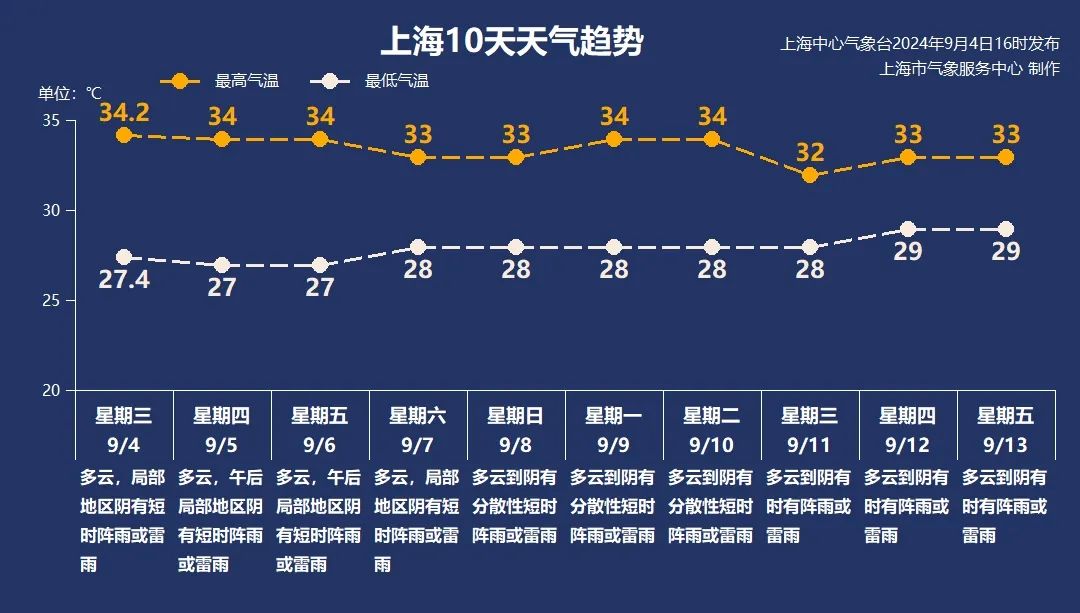 未来十天,副热带高压稳如磐石,上海天气炎热,最高气温维持在33-34℃,偶尔也会有35℃高温冒头。天气以多云为主,升温迅速,午后局部有热雷雨。周日起偏东气流带来海上充足水汽,又是蓝天、白云、乌云、阵雨随机切换的天气。请大家及时留意临近预报,继续做好防暑降温工作。