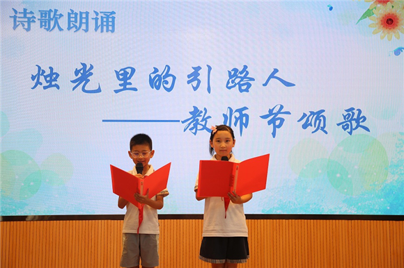 随后,由学生林艺涵、苏博睿带来诗朗诵《烛光里的引路人——教师节颂歌》。孩子们用饱含深情的诗朗诵表达了对老师们的感激之情和节日的祝福。