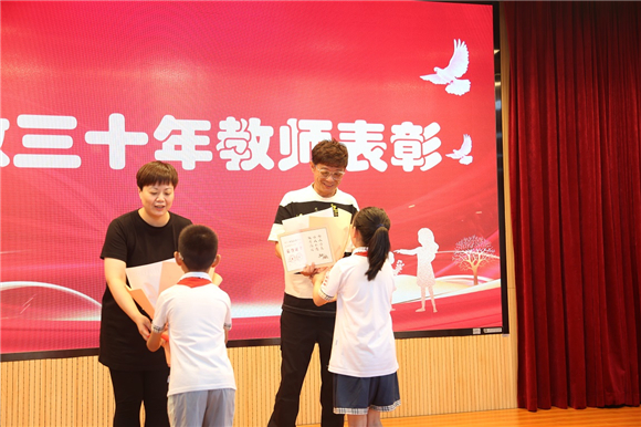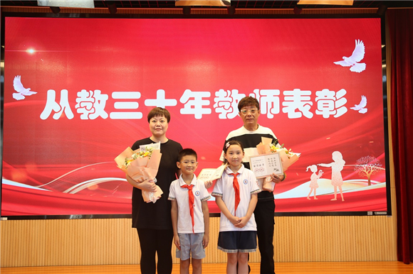 三十年如同一颗璀璨的火种,点燃了无数学生的智慧之火;三十年如同一道明亮的星光,照耀了无数学生的前程之路。三十年来,吴海颖老师、欧阳海峰老师默默耕耘,无怨无悔。会上,王校长为他们颁发三十年教龄荣誉证书,随后学生为两位老师献上鲜花。