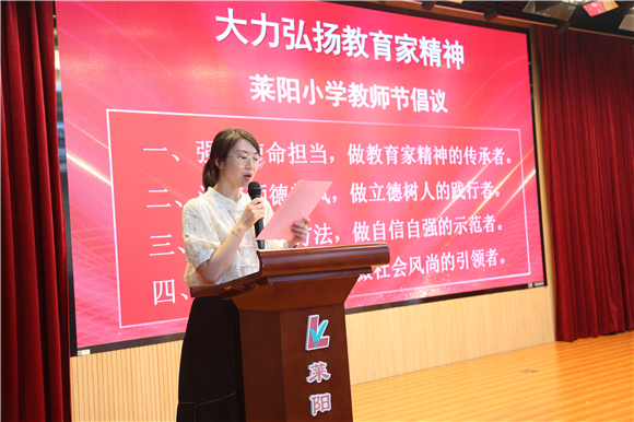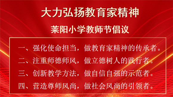 学校一直秉承“励志、崇德、体验、创新”的校风,全体教师静心教书、阳光育人,培养德智体美劳全面发展的社会主义建设者和接班人。活动中,金璐萍老师给大家朗读莱阳小学教师节大力弘扬教育家精神的倡议书:让我们携手同行,弘扬教育家精神,共同为培养“三有”好少年贡献我们的智慧和力量!