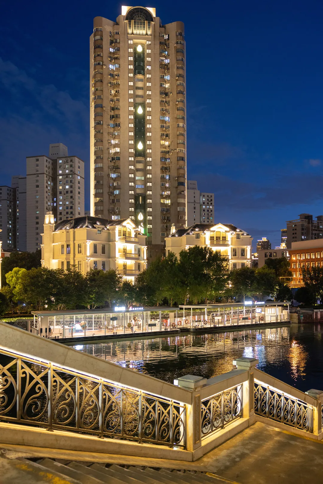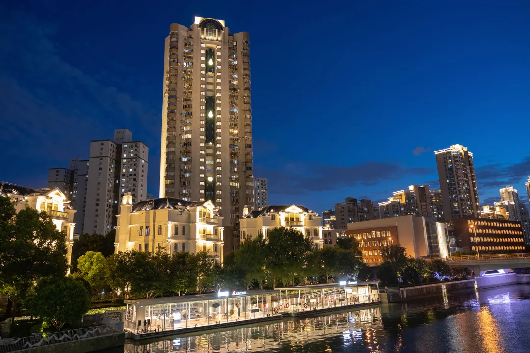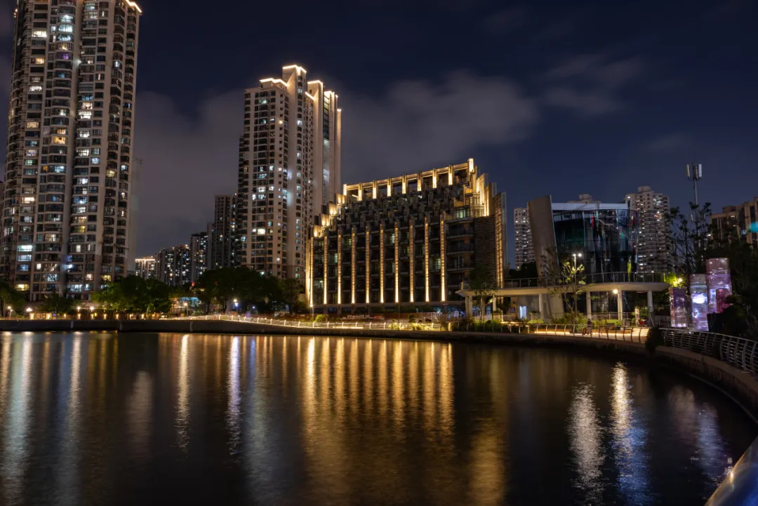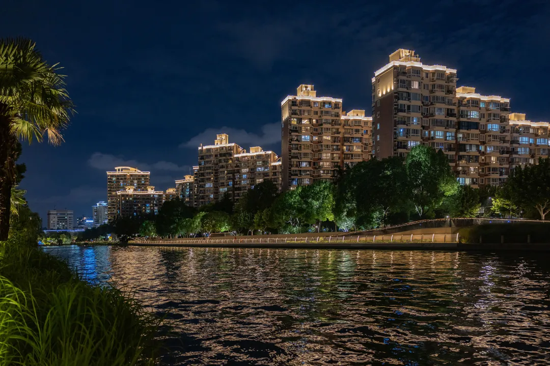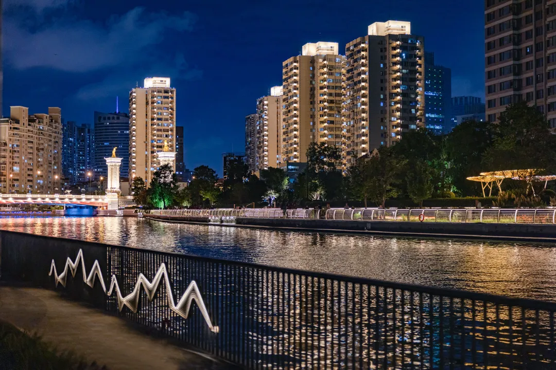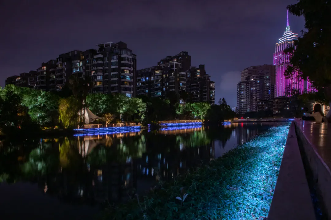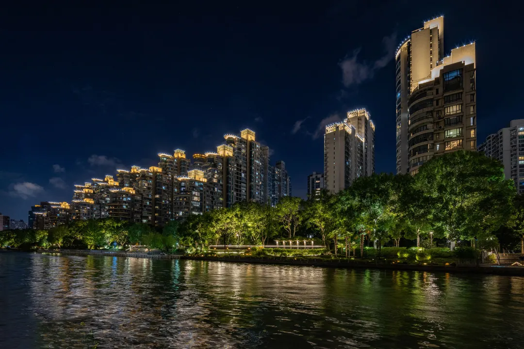 来苏州河,怎能不来花园湾呢?随着夜色加深,两岸住宅小区全新升级的景观灯光亮了起来,为行人柔和地指引着方向。
