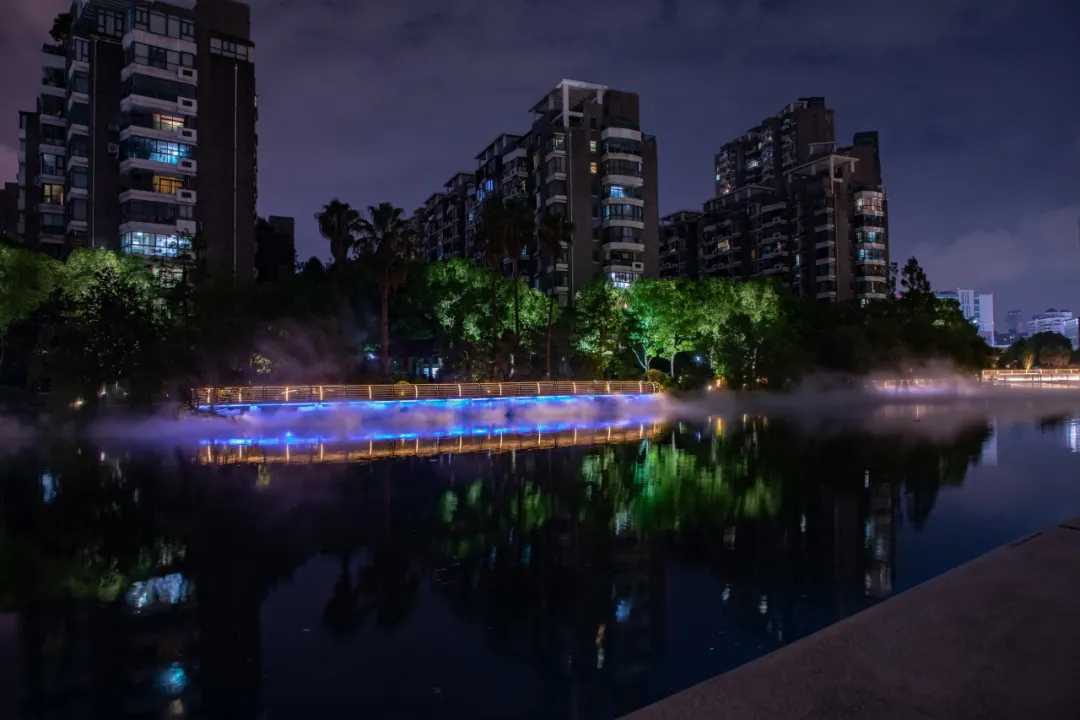 而九果园湾段的滨水空间在雾气缭绕和激光映衬下,绿意盎然的植物更显得生机勃勃,住宅楼宇的建筑剪影在夜色中与灯光交织,显得格外优雅,与周围的自然环境相得益彰。不仅是一个放松身心的好去处,更是一个展示现代科技与自然美景相结合的艺术舞台。