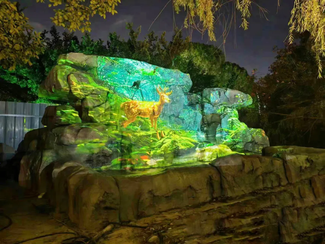潘家湾往西途径昌化路桥,抵达梦清湾滨水空间。随着夜幕的降临,生态草岸上的雾森系统轻轻开启,轻柔的雾气缓缓升起,其间穿插着形态各异的小动物灯光小品,令人仿佛置身于一个生动的自然画卷之中。从游船视角望去,《山涧溪流》装置巧妙地模拟了山涧溪流的自然风貌,光影交错间,仿佛真的在一条蜿蜒曲折的山涧中穿梭。