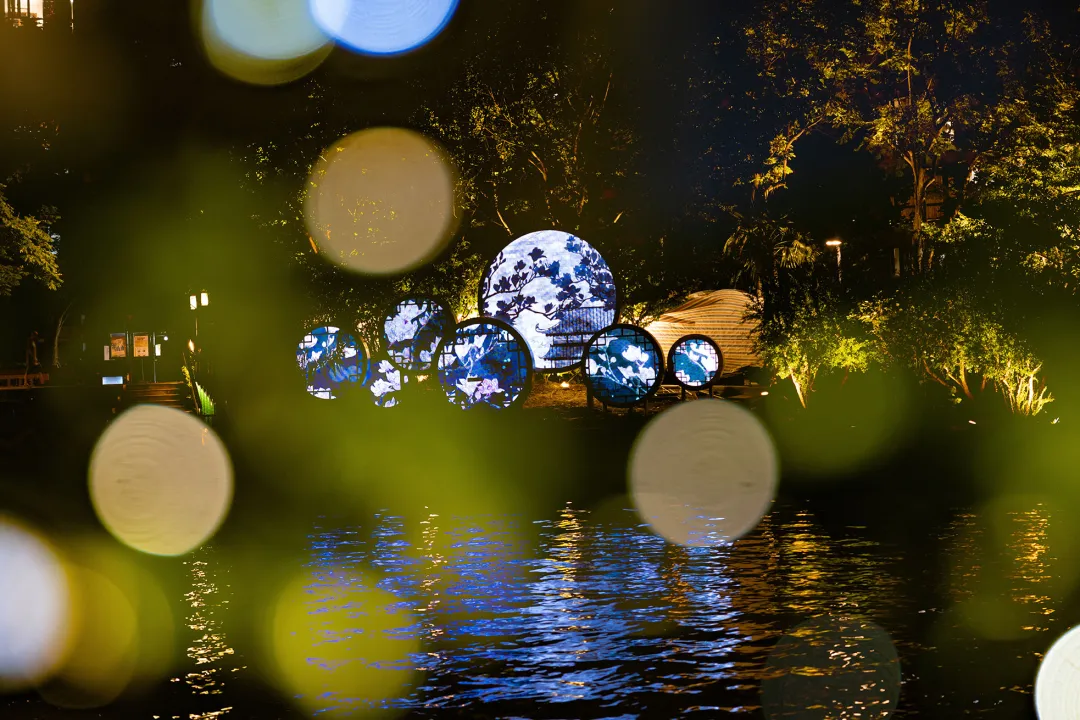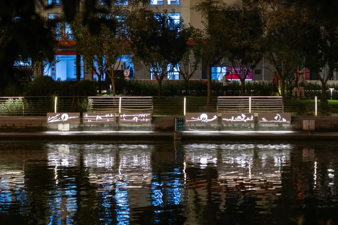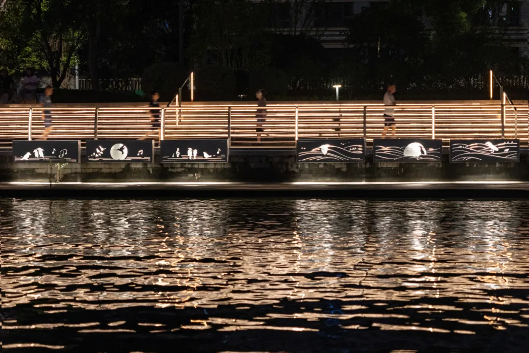 《鸢飞鱼跃》艺术灯光装置就在其间,像自由翱翔的鹰,像轻盈跃动的鱼儿,悠扬的乐声悄然响起,与缓缓的水声交织,感受着历史与现代的完美碰撞。