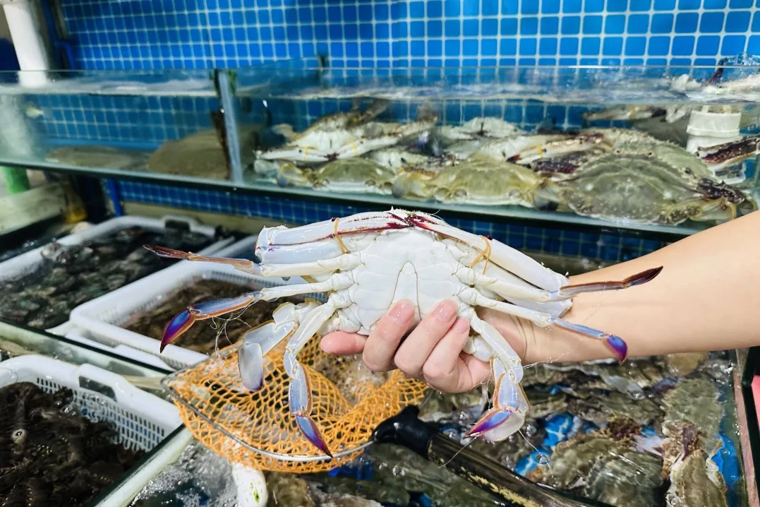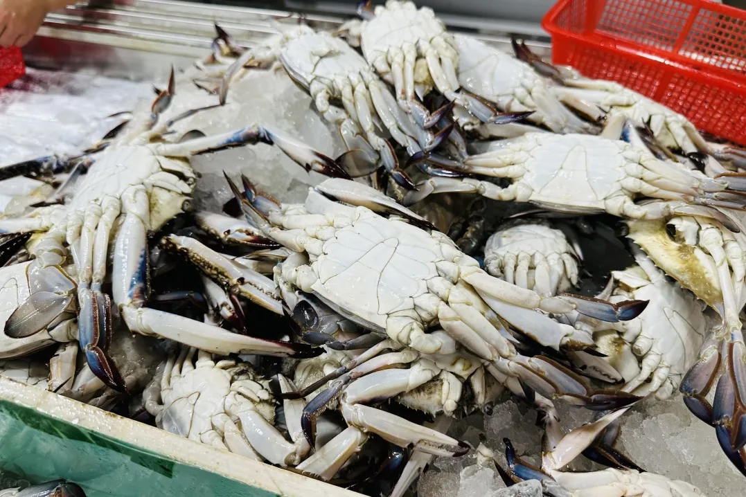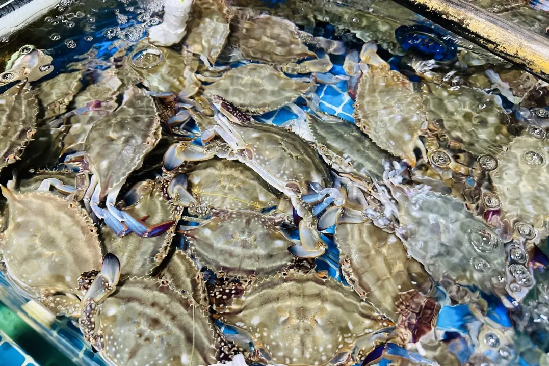 挑选梭子蟹也有一番学问。要选择蟹壳青中带蓝、蟹腹洁白、不能发黑、蟹脐饱满的个体,另外可以看蟹的肚脐和两个尖角的地方,是否有浅红色,颜色越深越好,这样的梭子蟹肉质更肥美。