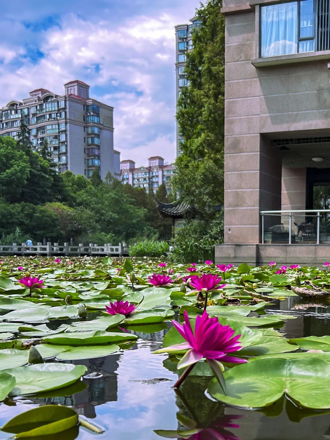 夏秋交替,闷热依旧,当城市的喧嚣让人心生烦躁之时,宝山区庙行镇宝宸怡景园却悄然绽放出一幅幅令人心旷神怡的画卷。景观池塘中,莲花亭亭玉立、竞相盛开,与小桥、楼阁相映成趣,共同构成了一幅旖旎的风光画卷,让你可以尽情享受自然与人文的双重盛宴。