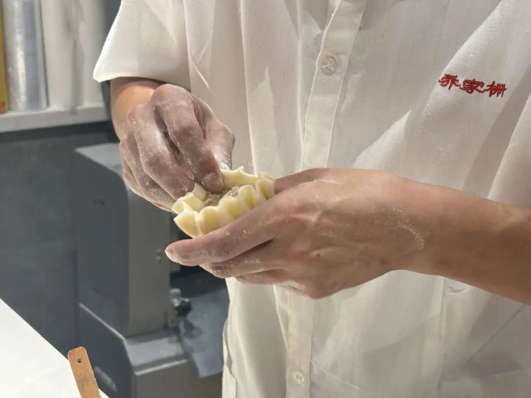 “我们的饼皮添加了小麦粉、饴糖、猪油等,这样做出来的饼皮皮层酥松,层次分明。”后厨中,经验丰富的张师傅正将混合均匀的面团仔细摊开,折叠揉搓后分成单只重约40克的小面团,每个面团中再包入35克左右用鲜嫩鸡腿肉与秘制藤椒酱混合的肉馅,最后将包好的月饼放入模具中压实,再用红色甜菜头汁在月饼表面盖上独特的口味印记,一只藤椒鸡肉月饼就包好了。