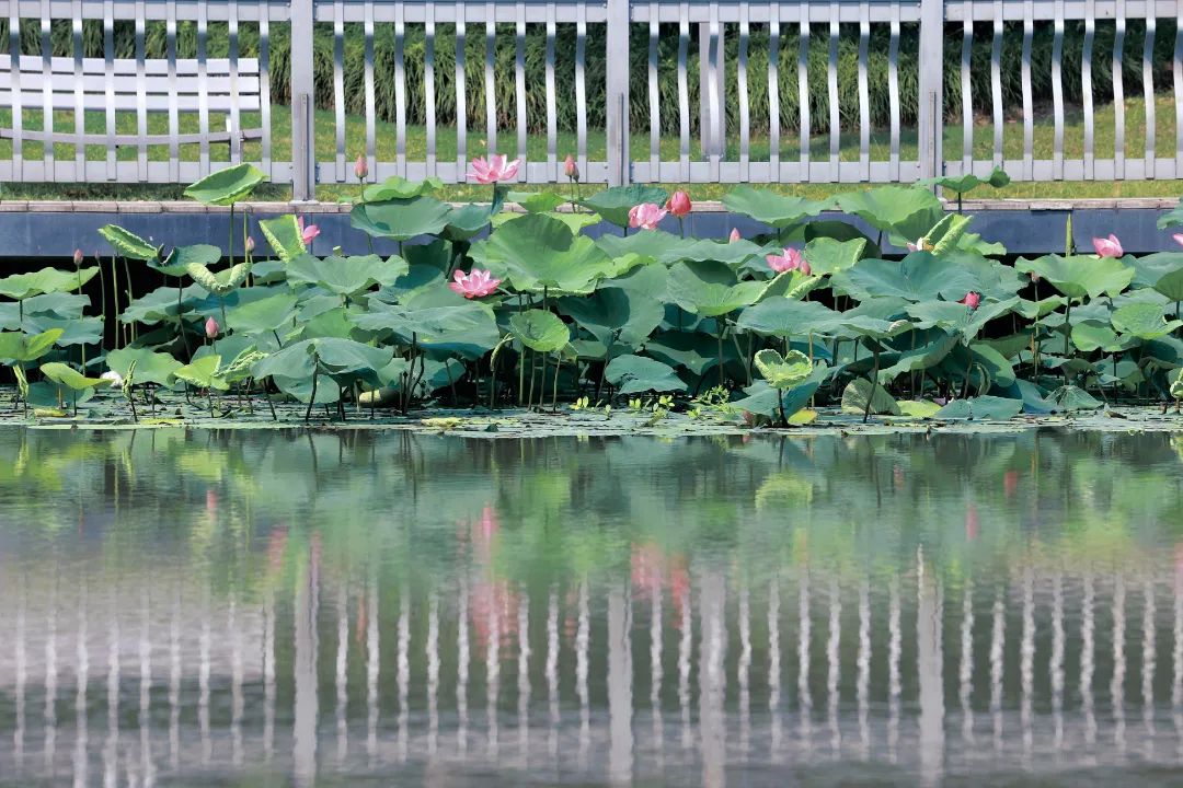 宽大厚实的荷叶托起一朵朵盛开的荷花,