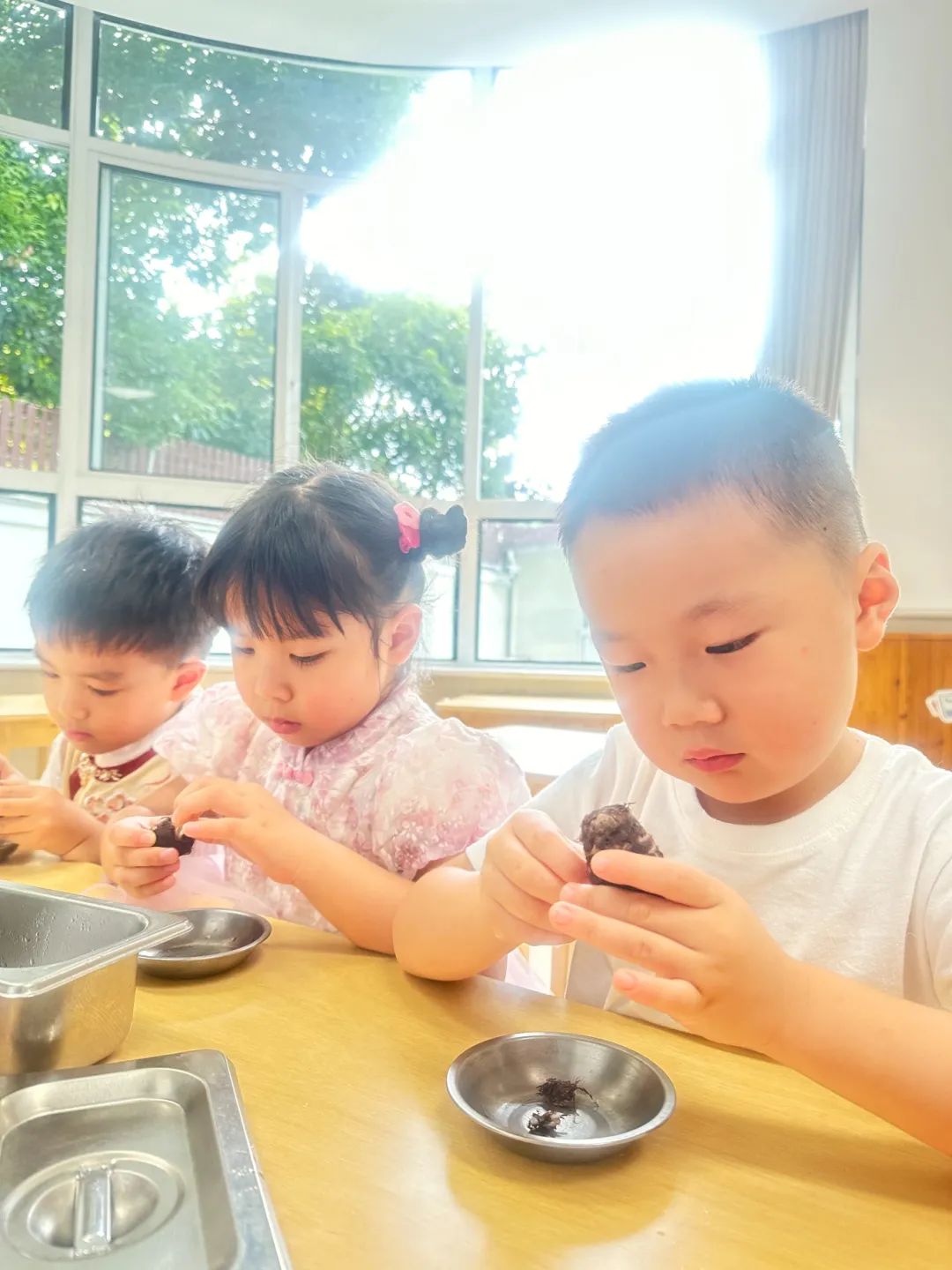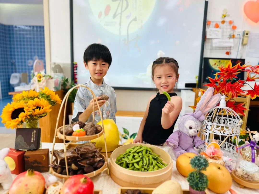 印象幼儿园的老师向孩子们介绍中秋节为什么要吃芋艿和毛豆。农历八月正好是芋艿上市时节,而且江南方言念芋艿谐音“运来”。所以,中秋吃芋艿,不仅一享口福,而且表示好运连连;毛豆,又称“毛豆荚”,“荚”音谐“吉”,表示吉祥如意。孩子们在点心时间,吃到了寓意着“好运”“吉祥”的芋艿、毛豆,和同伴们感受欢聚的快乐。