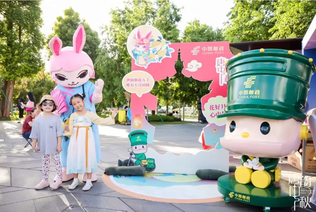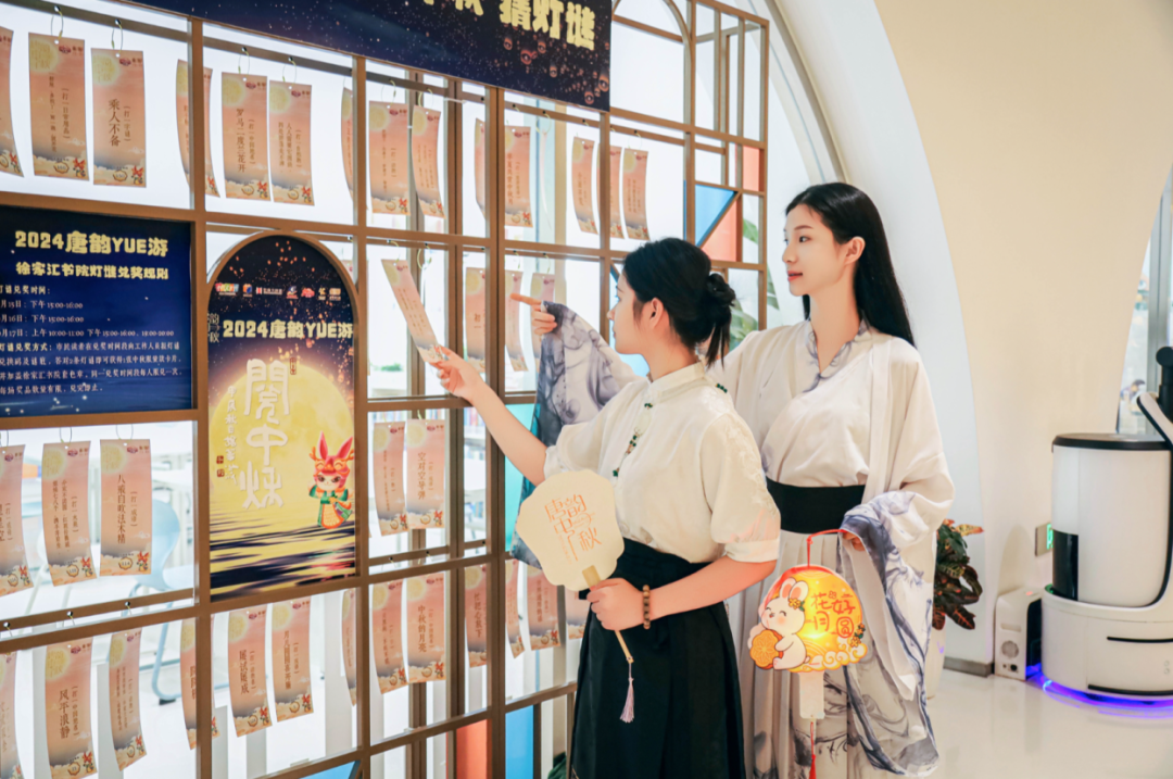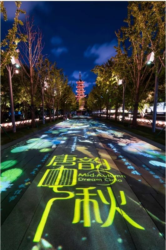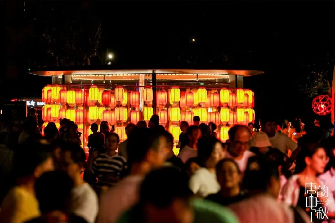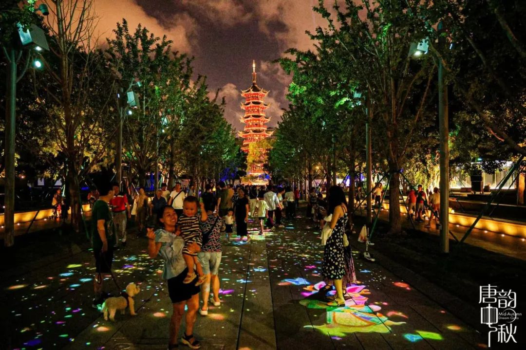 活动现场,许多身穿汉服,手提荷花灯、鲤鱼灯的游客也成为他人打卡的目标。身穿汉服的孩子们兴奋地穿梭在塔影空间的“唐韵游园雅集《迎月十二铺》”的摊位前,观赏着精美绝伦的非遗艺术;奔跑在银杏大道上,追逐着“唐韵龙龙兔”在大道上的投影;流连在广场上“玻璃盒子”化身的灯谜墙前,一个个灯谜猜过去,乐此不疲。